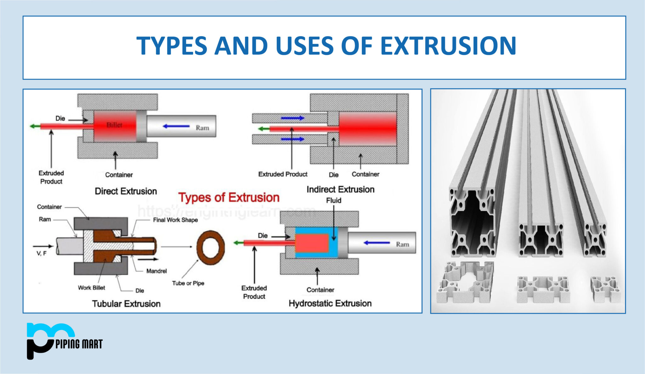 This billet is placed in an extrusion press, heated during hot extrusion, or left at room temperature. The metal is placed in a cylinder and pressed by a piston in the extrusion press, which is similar to a piston-cylinder mechanism. A die is attached to the cylinder’s upper portion.